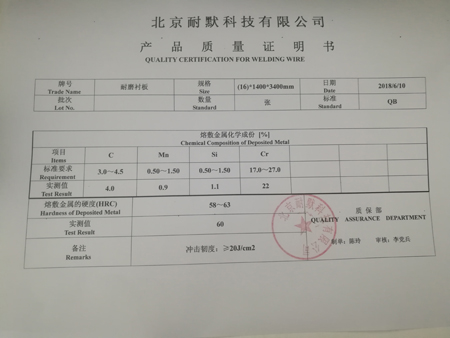 耐磨襯板材質(zhì)單是耐磨襯板的主要成分和性能指標(biāo),北京耐默公司每種每批耐磨襯板都有專配的耐磨襯板材質(zhì)單。